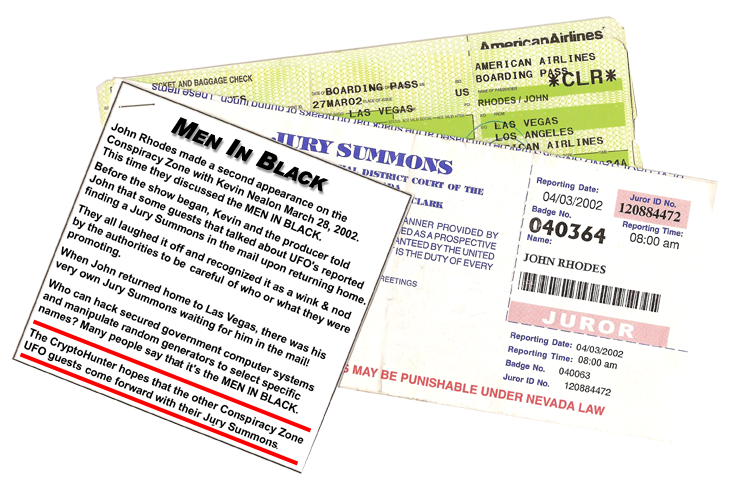 MIB ACTIVITY? During his last conversation with segment producer Johnathan Walton, Rhodes was informed that all the forensic sketches made by the artist of his MIB descriptions were discovered MISSING - MIA - after the crew returned to their offices! Were the forensic images simply misplaced by a tired crew or lost by the artist? Could they have been taken by some unscrupulous, on-location low-brow passerby as a souvenir? Could REAL MIB's have " visited " the UFO Hunter production offices after the crew's return to steal sketches that could have possibly revealed an agent's true identity? We may never know for sure what happened, but one thing is certain: During the course of his investigations, the CryptoHunter has met the the MIB before, and he will probably entertain encounters with them in the future! |