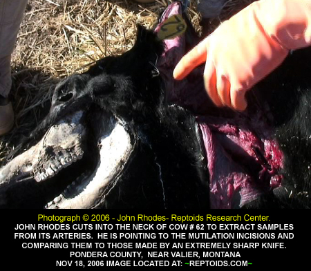 IN A NEW YORK TIMES INTERVIEW (9/17/01), HE SAID THE BRAND INSPECTOR SAID HIS MUTILATED COW WAS NOTHING MORE THAT THE VICTIM OF A LIGHTNING STIKE. BRIAN SAID THERE WAS NO LIGHTNING THAT NIGHT and that IT LOOKED LIKE IT WAS DONE WITH INSTRUMENTS! HE NOT ARGUE THE BRAND INSPECTOR'S DISMISSIVE COMMENT ANY FURTHER (He has yet to take action as governor of Montana to help find funding for investigations into these myterious, ongoing felonies).