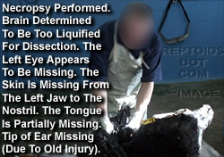 It's left cheek was missing, and the flesh was peeled to the bone.